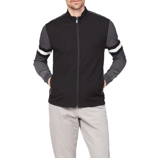Armlet bomber jacket from Jeff Banks. Crafted from a lightweight fabric, this jacket features a three-stripe design at the sleeve in ribbed fabric and a contrasting knitted back and sleeves, with a full-front zip and side pockets. Wear over chinos and a t-shirt – adding interest to any wardrobe, encompassing both sartorial style and superb comfort.