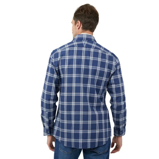 A smart, formal shirt for men by Jeff Banks Bespoke – with 100% cotton fabric and a cutaway collar in a classic men’s checked shirt. A navy formal cotton shirt with a tailored fit, long sleeves, curved cuffs, with Jeff Banks branding and a versatile navy check print, the perfect shirt for any occasion, no matter the season.