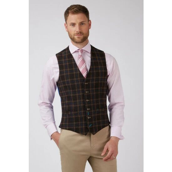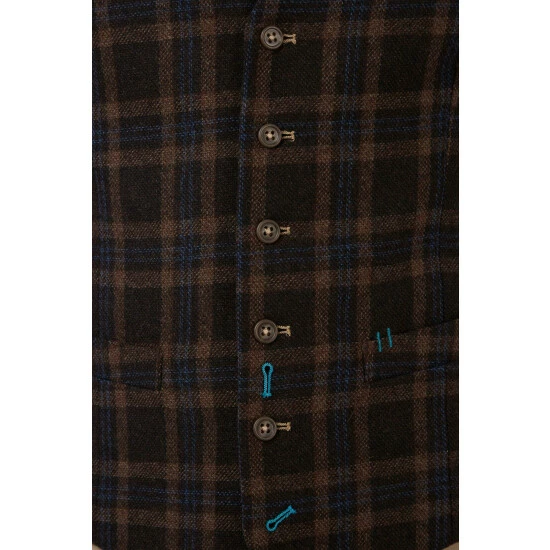 Check Blazer by Jeff Banks. A stylish two button blazer based on the inimitable Jeff Banks Saville Row block. Cut from a soft wool and polyester blended fabric with a myriad of colour hidden in the design. Two patch pockets give a feeling of casual dress. This superb piece of tailoring is half lined in viscose satin to give a lightweight feel. The sleeves are lined with a vintage stripe and punctuated with drafted urea buttons. The cuffs have four different colour buttons reflecting the colour in the complex woven fabric.