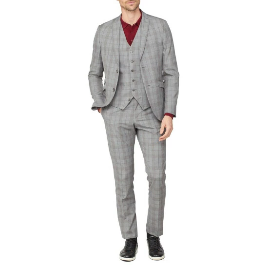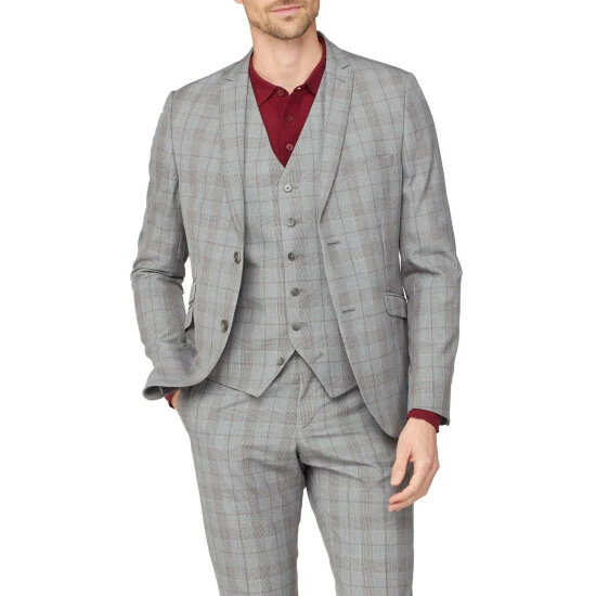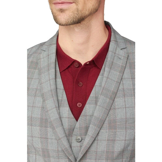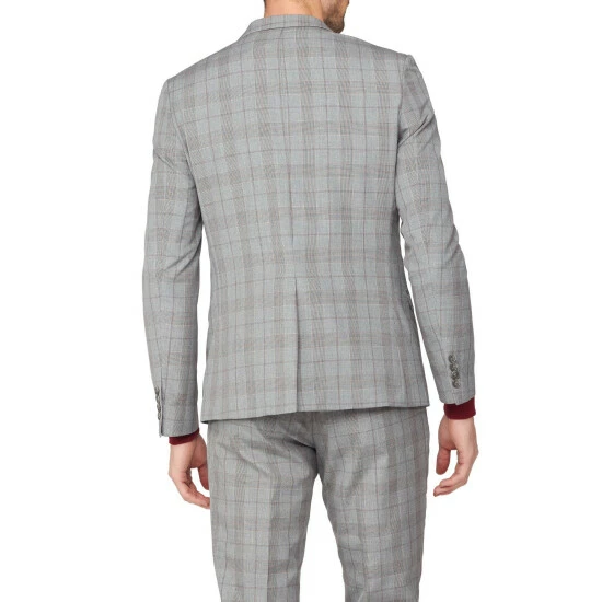Update your formalwear collection with the ‘Grey with Red Check Super Slim Fit Brit Suit Jacket’ from Jeff Banks. The jacket is styled with a 2-button fastening, notch lapel and 4 button cuffs. This contemporary jacket is a transitional piece that will take you from wedding to weekend. Wear smart with matching trousers and waistcoat, or casual with grey t-shirt and trainers.