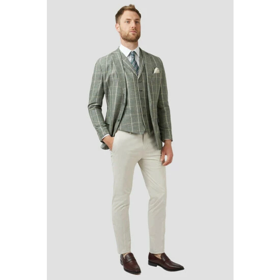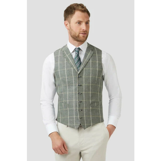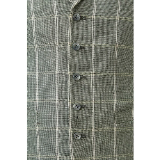 Check Waistcoat by Jeff Banks. A double windowpane woven textured cotton fabric. Styled into a two-button single breasted blazer fully lined in handsome viscose satin lining. The sleeves are lined with a vintage stripe. The lapels are fashionably wide, finished with defining hand stitching. Crafted urea buttons punctuate this stylish addition to any wardrobe.
