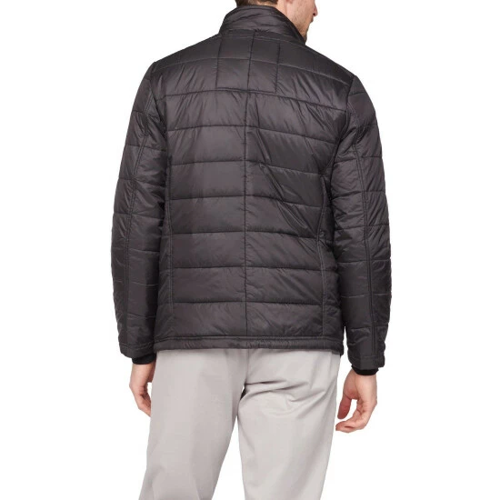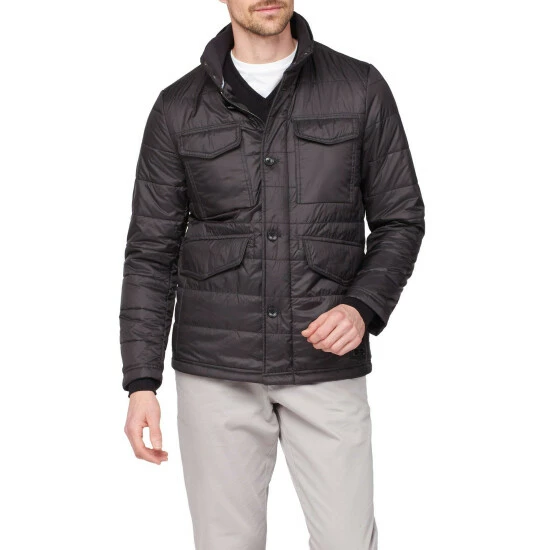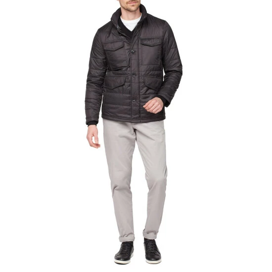 Lightweight quilted jacket by Jeff Banks. This style has lots of storage with four external flap pockets with popper fastening and three internal pockets including a phone pocket, featuring a funnel neck and rib collar insert with popper fastening, finished with the Jeff Banks signature metal badge at the hem. Wear over chinos and a t-shirt.