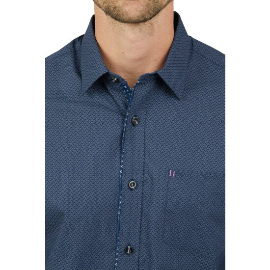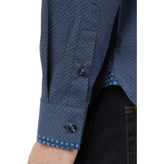 A stylish men’s smart-casual shirt from Jeff Banks London. This tailored fit shirt is a stylish, navy colour for any wardrobe.This long-sleeved shirt is loaded with detail – boasting a forward point collar, contrast under placket trims, a chest pocket and contrasting fabric in the back of the neck, completed with Jeff’s signature stab stitch.A versatile addition to any wardrobe from Jeff Banks menswear – this navy button up is an instant winner for any wardrobe.