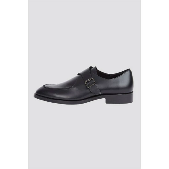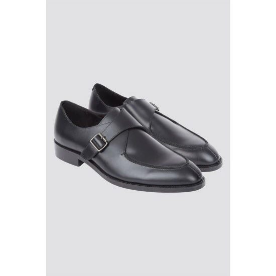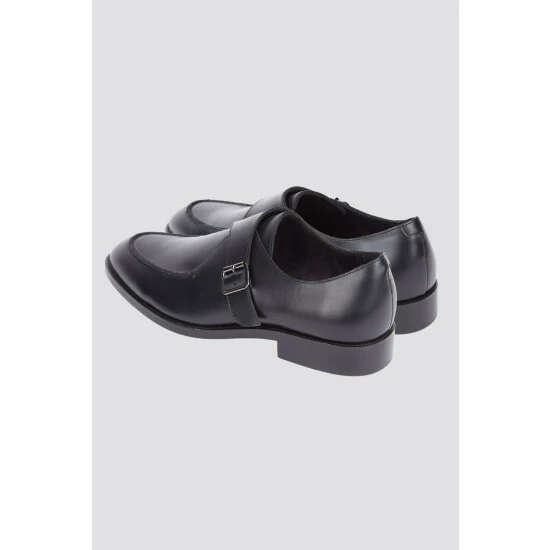 Monk Strap Formal Shoe by Jeff Banks. This side buckling classic monk shoe in a dull finished calf leather. The shoe incorporates a split toe front in an apron shape. The heel is 25cm with a half rubber finish. This matches the rubber inside on the stitched sole.