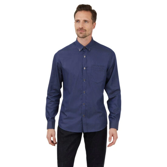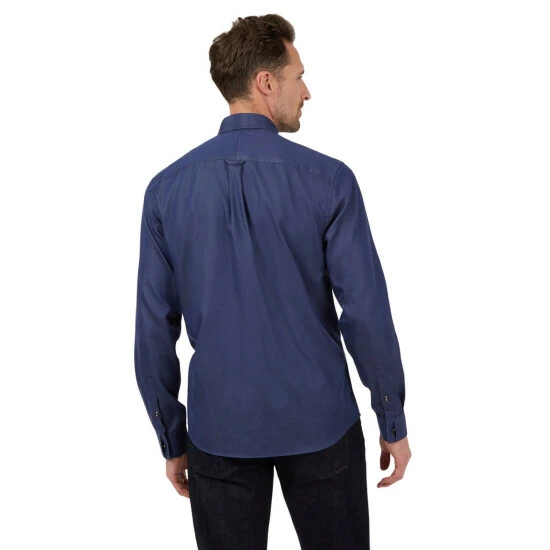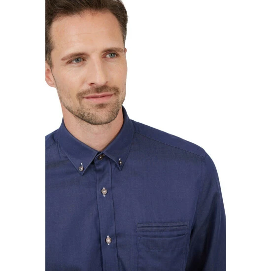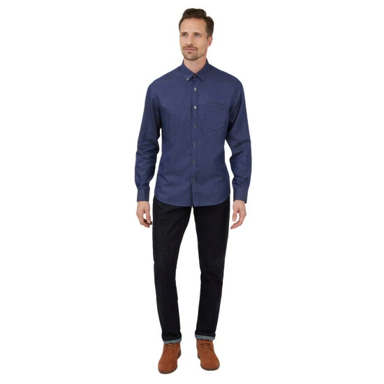 The Jeff Banks London smart-casual shirt range is a tailored fit range of shirts with carefully considered design details in each garment. This long-sleeved shirt comes in an indigo twill effect fabric, with a button down collar. Design details include a chest and jet pocket, single cuffs and contrasting stitch detail, a versatile piece for any wardrobe.