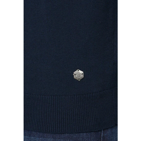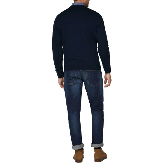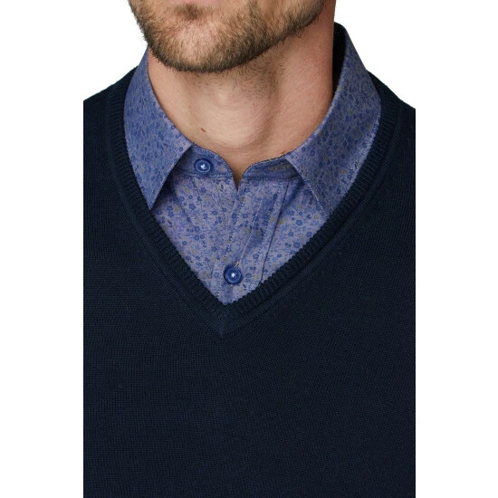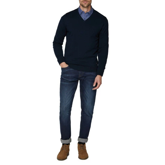Pure cotton V-neck jumper from Jeff Banks. This navy blue V-neck jumper is a classic style, designed for comfort, durability and versatility, with a ribbed hem and cuffs and a v-neck, creating a stylish men’s soft-touch long sleeved jumper design. Perfect for layering up in Autumn, this sweater is primed for a night out on the town – completed with a metal plaque on the side.