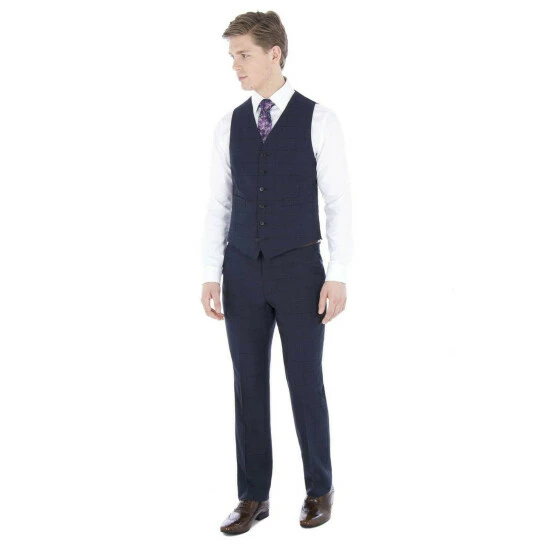 Windowpane Check Suit Waistcoat by Jeff Banks. The Jeff Banks Black Label collection draws its influence from the traditions of British tailoring. It is designed with the sophisticated man in mind who appreciates superior attire and a flattering silhouette. The shoulders are cut quite square and the waist, chest and seat measurement are slightly relaxed for a regular fit. This windowpane check waistcoat has 6-button single breasted fastening with unfunctional bottom button for a refined and understated look.