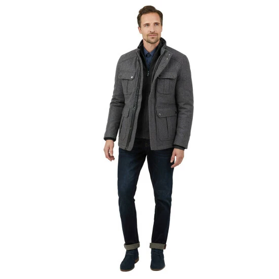 Jeff Banks craftsmanship encompasses both sartorial style and superb comfort. Crafted from a tweed and panelled PU fabric, this driving jacket is the perfect addition to your smart-casual wardrobe. It features a stand collar with branded popper fastening, full front-zip fastening, four external press stud pockets, two concealed side entry pocket, an internal patch pocket and zipped jet pocket. Finished with care, this men’s jacket features a signature metal badge to the back of the neck. A true piece of exemplary menswear from Jeff Banks.